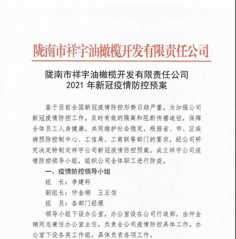 確保今年油橄欖鮮果收購工作圓滿完成,隴南市祥宇油橄欖開發(fā)有限責(zé)任公司根據(jù)實際情況及時成立了疫情防控小組,